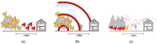 Types of wildfire heat flux transmission [27]. (a) Heat flux due to convection, radiation, and flame contact. (b) Heat flux due to radiation; no flame contact. (c) Heat flux due to firebrand accumulation.