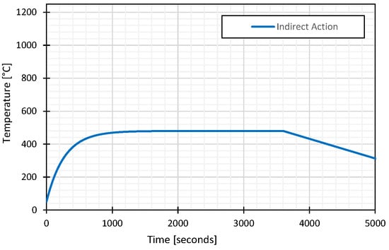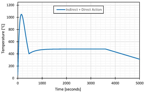 The direct contact from burning trees and bushes is referred to as the direct impact of a wildfire, while the accumulation of firebrands represents the indirect action of a wildfire on a building. When simulating the direct action, the wildfire envelope curve (3) is employed to replicate the influence of burning trees and bushes, transmitting heat through convection and radiation. Conversely, for the indirect action, the temperature curve associated with firebrand accumulation (4) is employed. The thermal parameter values are presented in Table 1.