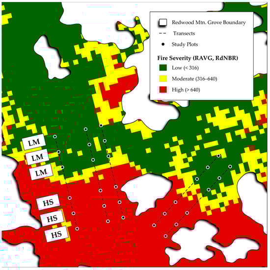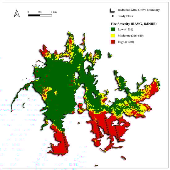 Our study was located in the southern portion of the Redwood Mountain giant sequoia grove in Sequoia and Kings Canyon National Parks within >150 ha of burned forest that experienced high-severity fires and adjacent low/moderate-severity areas in the summer and early fall of 2023, two years after the KNP Complex fire. Fire severity in this study was determined using Relative delta Normalized Burn Ratio (RdNBR) satellite imagery data from U.S. Geological Survey’s Rapid Assessment of Vegetation Condition after Wildfire (RAVG) database (https://burnseverity.cr.usgs.gov/products/ravg, accessed on 10 January 2024). We used the Relative delta Normalized Burn Ratio (RdNBR) thresholds identified by Miller and Thode (2007) [] to categorize fire severity, as follows: low severity (0–25% basal area mortality); moderate severity (26–75% basal area mortality); and high severity (76–100% basal area mortality).