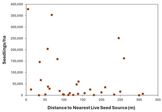 Naturally regenerating giant sequoia seedlings per square meter and distance (m) to the nearest live sequoia seed source.