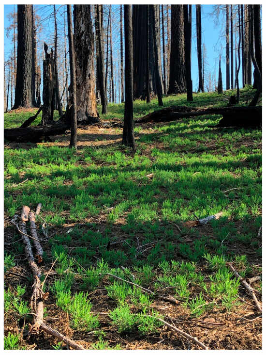 As an evolutionary adaptation, serotiny in modern conifer families, Pinaceae and Cuppressaceae, developed during the Cretaceous, 65–106 million years ago, ensuring that seed release from conifer cones (triggered by heat from wildfire) and seedling germination occur during the optimal conditions for establishment and growth that are created by intense fire []. For giant sequoias, these optimal conditions, created in particular by patches of crown fire, have been described as including the consumption of all duff and litter on the forest floor and conversion of this material into a nutrient-rich bed of mineral ash, as well as high or complete mortality of the forest canopy, which provides additional sunlight that facilitates growth of seedlings and saplings [,]. Seedling germination and establishment are unlikely in the absence of fire.