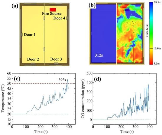 Obviously, people would be dangerous as long as the fire grows beyond the limits specified in any of the above conditions. Based on the fire scenario in this paper, a PyroSim model of the core area was built, and the simulating computation has been conducted. The source of ignition was set as polyurethane (PU) material. According to the relevant technical regulations for smoke control and extraction in China, the fire power was set at 4.5 MW, and the fire growth pattern was t2. The model was as shown in Figure 2a. The emergency condition that the mechanical smoke exhaust in the factory was invalid and only natural smoke extraction worked by using the openings of doors and windows was chosen as the situation for modeling. Monitored points for visibility, CO concentration and temperature were settled on each door, and the corresponding data are shown in Figure 2 as well.