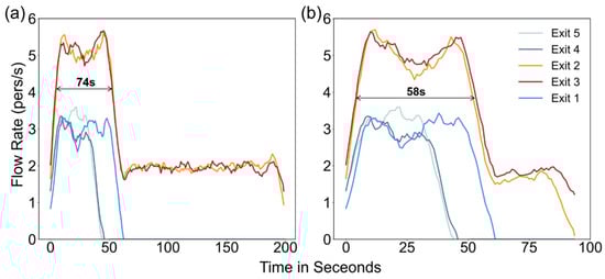 An analysis of the utilization rate of the five exits separately is shown in Figure 4a: Three exits numbered 1, 4, and 5 were mainly used for evacuating the original occupants on the first floor. Therefore, at 54.7 s, the flow rate would reach 1 pers/s, and then it “failed”, which was consistent with the simulation process. In the whole evacuation processing, the exit that assumed the main evacuation function was the south exit, and the flow rate was maintained at 1.96 pers/s after 74.0 s. Hence, the width of the south exit played an important role during the evacuation.
