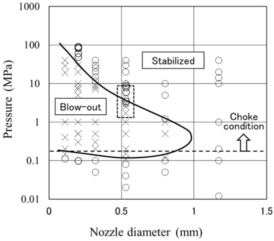 To clarify the conditions for sustained lifted flame existence and flame blow-out, several studies have been conducted, e.g., [20,21]. Figure 1 demonstrates that for any nozzle diameters below 1 mm, there are two pressure limits of flame stabilisation (below the lower curve and above the upper curve), which are functions of nozzle diameter. The sustained flame lower pressure limit indicated with dotted line in Figure 1 is about 0.1–0.2 MPa regardless of nozzle diameter below 1 mm. This is consistent with the choked flow condition for hydrogen. However, the upper pressure limits on the high-pressure side are not as simple to explain [22,23,24,25]. For example, for a 0.2 mm nozzle diameter, pressure above 60 MPa is required to sustain the flame.