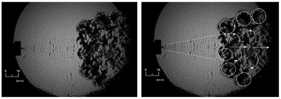 Under steady flame conditions with a jet pressure of 8 MPa, a typical schlieren image of hydrogen flame is shown in Figure 2 (left). Figure 2 (right) demonstrates, via white lines and circles, the important phenomenon observed in the high-speed photograph. The movement of gas away from the centre of the jet in a vertical direction near the flame base is observed (see Figure 2, right). This movement is due to a combustion reaction forming spherical flame structures with a diameter of about 5–7 mm, which are indicated in Figure 2 (right) with dashed circles. Since the schlieren photograph is an integrated image through the optical path, spherical flame structures can be recognised clearly along the edge of the image. The flame structures are formed one after another in the process of combustion, and flame retention continues. These flame structures extend outward from the location of the velocity boundary of the jet (see two white lines in Figure 2, right). They cover the premixed hydrogen–air flow and are observed to be lightly rotating as they are pushed outward from the jet axis.