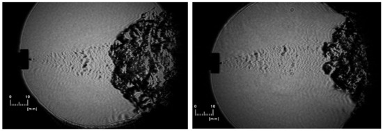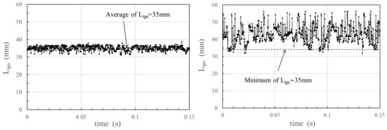 Figure 4 shows the fluctuations in time of the lift-off distance from the nozzle outlet to the flame base derived from schlieren moving photos (20,000 f/s). The position of the flame base was determined by digitising the shading of each schlieren image. The values of for 8 MPa are almost constant with variations of 5 mm or less, but for 3.5 Mpa, variations are as large as 20 mm. Under both conditions, the minimum values of were found to be practically the same, i.e., 35 mm. It can be seen from Figure 4 (right) that, for 3.5 Mpa, the flame structures are oscillating with larger amplitude, i.e., moving in the nozzle direction for a moment but then immediately moving downstream to repeat it again and again. Contrary to this, at the pressure of 8 Mpa, the clump-like spherical flame structures shown in Figure 2 are formed one after another in approximately the same position shown in Figure 4 (left).