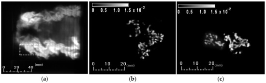 Figure 5a shows integrated OH distribution over 20 consecutive 10 Hz laser shots under the condition of sustainable flame. The reaction zone spreads outward from the central axis of the jet with vortices. The shape and scale of vortices, and lift-off distance could be compared to previously performed LES simulations [33,34,35]. Figure 5b,c show the single shot images of the region indicated by the dashed line in Figure 5a. The spherical structures of about 6–10 mm in diameter, composed of flame clusters, are observed. Although the OH distribution is the planar image cut by the central axis, it can be estimated that the spherical flame structure has multiple complex flamelets within it. In addition, the experimental conditions of Figure 5a–c are for orifice diameter of 0.2 mm and pressure of 82 MPa, (different from those in Figure 2, Figure 3 and Figure 4), with higher under-expanded jet flow conditions, yet the fundamental phenomenon can be seen as described previously.