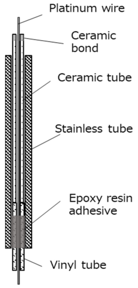 Figure 6 shows the schematic illustration of the ion probe used in the experiments. The 50 μm diameter platinum wire receiving the ion signal had its tip exposed to flame only 0.5 mm from the ceramic tube. Since the ion current is weak to noise because the probe is an open circuit with high electrical impedance, it is important to improve the signal-to-noise ratio. To overcome it, a lithium-ion battery was connected in series as the power supply to detect ions in the flame at a high voltage of −50 V and the platinum wire was electrically shielded by a stainless steel pipe, 3 mm in outer diameter. From the previous results of the PIV measurements, the gas velocity measured near the flame base under the present experimental conditions was about 20–100 m/s [30]. To obtain an accurate waveform of ion current with a spatial resolution of 0.1 mm, a data sampling velocity higher than seems necessary if considering 20 datapoints in a cycle of signal would be necessary for accurate analysis. To accomplish it, a high-speed data recorder (HIOKI MR6000) capable of recording up to 200 M samples/s was used for data acquisition.