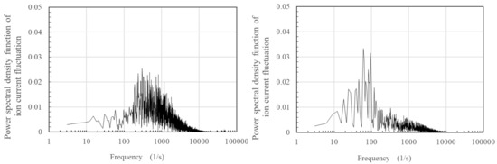 Typical cases of the relationship between the power spectral density function () of ion current fluctuation and frequency () of fluctuation are shown in Figure 7. In the calculation of , 216 = 65,536 time-dependent datapoints of instantaneous ion current were analysed using the Fourier transform procedure to obtain Fourier components . These components were then converted to with the basic equation , where and represent frequency of fluctuation and period of data acquisition, respectively.