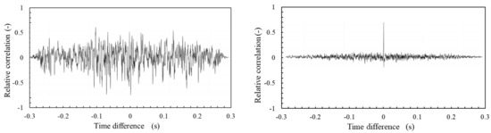 Cross−correlations of two probes with 5 mm interval (left) and 15 mm interval (right), under the steady flame conditions ( = 0.53 mm, = 8 MPa).
