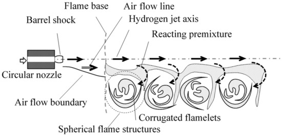 Based on the results of measurements and discussions described so far, the flame stabilisation mechanism of a high-pressure hydrogen jet flame is considered as shown in Figure 9. It highlights the dynamic and complex nature of the mixing and combustion processes used to generate the flame structures observed in the experiments. Within the air flow boundary, the high-speed air is entrained by the decelerated flow of hydrogen downstream from the Mach disk. The interaction of two gaseous flows forms a flammable premixture, which is supplied to the lifted flame to create spherical flame structures that are lightly rotating clockwise as seen in Figure 9. As a result of these complex interactions, the fast combustion reaction at the base of the flame results in the expansion of the burning structure perpendicular to the jet stream and beyond the flow boundary. A high concentration of HO2 radicals, which form from the initiating reaction (H2 + O2→HO2 + H) in the radical reactions of hydrogen–air, has been reported to exist in the central axis area of the hydrogen jet flame [12,20]. The reacting premixture shown in Figure 9 receives heat from the outer spherical flame structure and the endothermic initiation reaction is considered to be promoted.