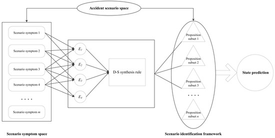 The occurrence and development of a major accident is a systematic process consisting of information from different periods. Information on the accident scenes during different periods is often incomplete and insufficient. However, this information can reflect scenario states of the accident at different stages from different aspects. That is, the accident scenario symptoms. Through these symptoms, evidence can be discovered to judge accident states. Among the evidence, the preliminary judgment made by the decision-maker on the accident scene can be viewed as an evidence system, and some historical data, data obtained with various technical means, expert knowledge, and empirical data can be included in the evidence system, too. The D-S evidence combination rules can be used to fuse the accident evidence and, therefore, the prediction results of accident situations can be obtained. With more data information obtained and used as the basis for the next step in situation prediction, the development trends of new accidents can be predicted. Therefore, foundations can be laid for on-site commanders to plan in advance and make deployment decisions so as to implement scientific and effective emergency decision-making. Figure 2 shows the model framework.