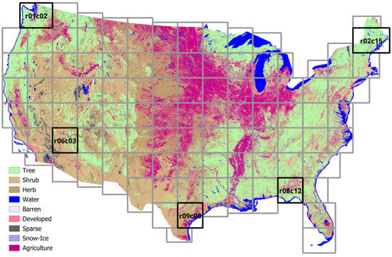 LANDFIRE ingests data from multiple sources (refer to Supplementary Table S1) for product generation and uses Landsat satellite series reflectance observations for remotely sensed disturbance detections. Landsat-based imagery is composited (refer to Section 2.2.1) and divided into 98 (Figure 1) nonoverlapping tiles [35]. Based on analysts’ experiences, tiles that encompass a variety of vegetation types and disturbances were selected for prototyping and are highlighted in Figure 1.