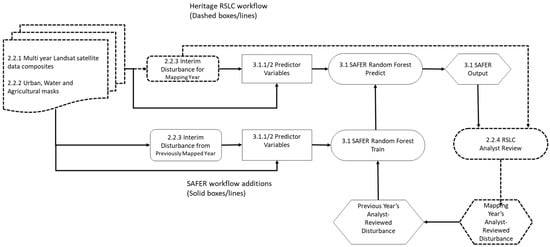 Heritage RSLC process (dashed boxes and lines) and the SAFER workflow additions (solid boxes and lines) flow chart. Please refer to the section numbers given in each process box for details.