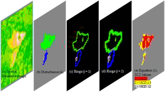 Graphical illustration of the spatial change Z scores (SCZs) computation. The left-most is the reference image (a), whose values for disturbance (lighter and browner shades) and its neighbors (greener shades) are expected to be different. Contiguous disturbance (b) clusters are assigned a unique id k. Two rings ((c); j = 1 pixel and (d); j = 2 pixel wide) are grown around each unique cluster and are assigned the corresponding ids. Pixels in rings that are common to more than one ring(s) are identified (gray) and marked as invalid. Pixel values from the reference image with land observations for the valid ring pixel locations are extracted and used to calculate the mean (m) and the standard deviation (s). The ring with the lowest coefficient of variation (σ/μ) is selected, and the corresponding μ and σ are used in Equation (5) for each disturbance and results in the SCZ (e) values for each pixel in the disturbance. Refer to Section 3.1.2 for more details.