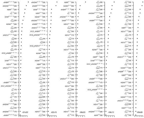 The top 30 most important variables to the random forest model during prototyping for tile-wise disturbance detections are illustrated in Figure 4. The complete list of variable importance of all variables is shown in Supplementary Figure S2. The differenced variables dNBR, dNDVI, and dNDMI generally ranked higher in importance than the other variables, which is likely due to their sensitivity in detecting vegetation-related disturbances [55], but they were not always the most influential variables in all tiles. Single DOY indices and TOA observations in some tiles ranked the highest (e.g., tiles r06c03, r08c12, r09c08). The spatial change probability Z score variable was within the top 25 of three of the five prototyped tiles, and generally exhibited a positive relationship with the difference indices. The fact that the difference indices and SCZs were low in some cases, but single-date observations were high, indicate that the disturbance signals in these tiles had poor spectral contrast. Tiles with lower ranking of difference indices and SCZ scores indicate that the vegetation disturbance spectral signatures were not prominent or that the vegetation had recovered within the compositing period, thereby minimizing the spectral contrast in pre- and post-image differences.