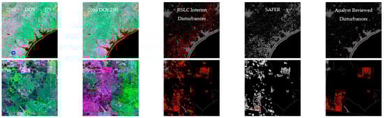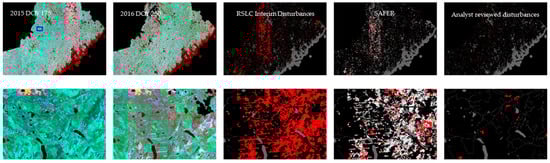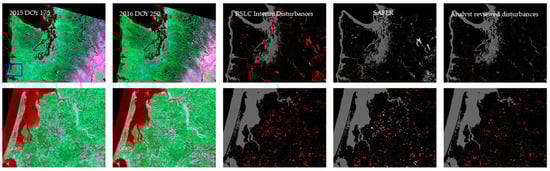 LF tile r06c03 predisturbance (2015 DOY 175) and post-disturbance (2016 DOY 250) false color (Shortwave Infrared 1 (red), Near Infrared (green), Red (blue)) images and results of RSLC interim disturbances, SAFER outputs, and LF-disseminated product. Detections are red, rejections are white, and unmapped regions are shown in gray. A 500 × 500 pixel subset (15 km × 15 km), marked as a blue outline in the top row, is detailed in the bottom row. Analyst additions are shown in yellow.