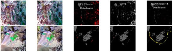 Feedback from LF analysts indicates that SAFER outputs are reliable and substantially reduce the level of effort when producing accurately mapped disturbance products. Estimates in time savings for editing a tile ranged from 1 h or less in dry/desert-like environments (like tile r06c03; Figure 1) to 8 h in tiles with persistent cloud cover, data gaps, and large amounts of disturbance such as in the northeastern United States (like tile r02c15; Figure 1).