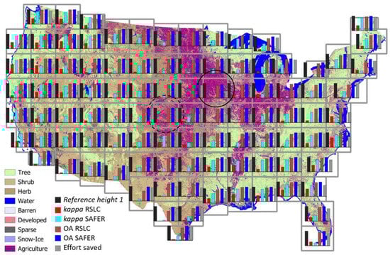 The 2017 SAFER evaluation results. The color-coded bar charts represent the classification’s overall accuracy (OA) of the interim RSLC disturbances (red and brown), SAFER (cyan and blue), and the relative effort (gray) saved, all scaled to unity (black). Accuracies and relative analysts’ effort saved (Section 3.2) is high for SAFER outputs over the whole CONUS. The relative effort saved ranged from 47.7% (solid black circle) to 99.4% (dashed black circle), with a median of 92.7%. LANDFIRE (LF) tiles (gray rectangles) over the LF 2016 life form classes [74].