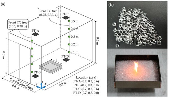 Experimental setup: (a) schematic diagram of the compartment apparatus and measurement devices; (b) photos of combustibles (PMMA) and square burner.