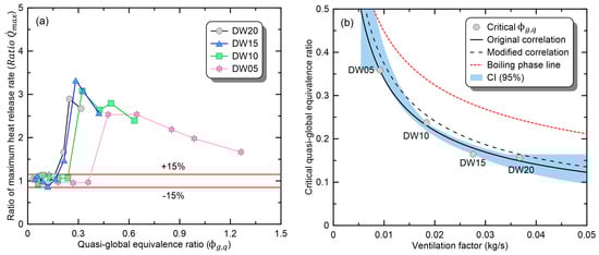 Figure 8 shows the selection criterion and analysis results of experimental conditions corresponding to the ‘boiling’ phase. As defined in Figure 3c, in the ‘boiling’ phase, there was a transition to the under-ventilated condition, with flame ejection through the opening. Considering this, Figure 8a presents photographs of the instantaneous flame under the conditions in which the first ejecting flame occurred for each opening. A comparison of the photographs indicated that with a wider opening, the ejecting flame was generated from a larger burner. The reason is that as the door width increases, the amount of air inflow increases and a greater fuel supply is required to convert to the under-ventilated condition. In this regard, there were also significant differences in the volume of the ejecting flame due to the differences in the fuel supply that generated ejecting flames. Additionally, it was confirmed that all conditions in which burners larger than those shown in Figure 8a burn under each ventilation condition correspond to the ‘boiling’ phase. Figure 8b shows the behavior of according to in the ‘boiling’ phase to derive the correlation of maximum HRR. In the ‘boiling’ phase, exhibited similar behavior (a linear reduction), regardless of the opening shape, in contrast to the ‘no-change’ phase. In the classification of the ventilation conditions, the ‘boiling’ phase corresponds to the UVF condition, and the UVF phenomenon is dominated by the ventilation condition. Consequently, the behavior of the ‘boiling’ phase depends on , and the correlation is defined using Equation (6). In conclusion, the maximum HRR according to the ventilation conditions of the compartment can be predicted by multiplying maximum HRR in an open environment by the obtained using Equation (6).