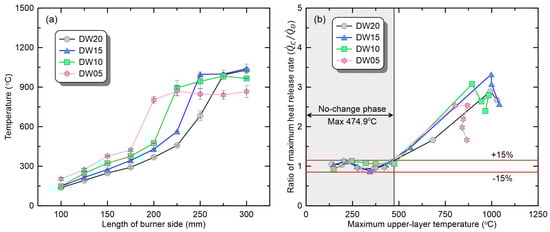 Figure 6a shows the average value of the maximum temperature measured at the front and back of the upper compartment. The temperature increased with the burner size for all the opening conditions. However, a change in the opening shape under the same burner size caused another change in the thermal environment inside the compartment. Comparing the upper-layer temperature in the range of L100 to L175, which corresponds to the ‘no-change’ phase in all opening conditions, the narrower the door width, the higher the temperature. In conclusion, under conditions of the same burner size, a narrower opening area results in reduced heat loss due to exhaust flow. This allows for achieving the thermal environment necessary for transitioning to the ‘promoted’ phase at smaller burner sizes (∴). Figure 6b illustrates the comparison of based on the maximum upper-layer temperature, showing that a wider door width results in more burners being classified into the ‘no-change’ phase. Through this, the reasons for the variation in critical based on the opening shape can be explained. Additionally, the highest recorded maximum upper-layer temperature in experiments classified as the ‘no-change’ phase is approximately 475 °C. Therefore, it is speculated that if the upper-layer temperature is below 475 °C, the PMMA fire is not likely to transition to the ‘promoted’ phase.