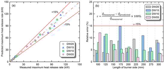 To evaluate the applicability of the derived correlations, Figure 9 directly compares the measured maximum HRR with the predicted maximum HRR and presents the relative error () of the predicted values. As mentioned earlier, the ‘promoted’ phase was observed in only two experiments among all conditions, and was excluded from evaluation because no correlation was derived. Figure 9a shows the predicted maximum HRR as a function of the measured maximum HRR. The values were very similar, within the error range of ±15% for all the experimental conditions. To quantify the accuracy of the correlation, the relative error of the predicted value to the measured value is presented in Figure 9b. For all the conditions, the relative errors were <15% (solid line), and the maximum relative error was 14.9%. This suggests that the proposed correlation can be used to predict changes in the maximum HRR of thermoplastics according to the combustion environment.