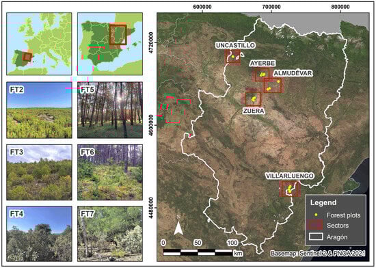 The study was conducted across 43 forest plots of a 15 m circular radius, except for one plot of a 10 m circular radius (Table S1 of Supplementary Materials). These plots were selected from those previously utilized by Hoffrén et al. (2023) [26]. They were distributed across 5 sectors of the Autonomous Community of Aragón (NE Spain) as follows: Almudévar, Ayerbe, Uncastillo, Villarluengo, and Zuera (Figure 1). The prevailing climate in these sectors is Mediterranean with a continental influence, characterized by sporadic and irregularly distributed rainfall throughout the year, substantial daily and annual thermal gradients, and convective storms, which are frequent in late spring and summer. The sectors of Almudévar, Ayerbe, and Zuera are located in the Central Ebro Valley, where climatic conditions tend to be more extreme, resembling steppe-like conditions with cold winters, very hot and dry summers, low precipitation, and a high probability of drought periods. On the other hand, the Uncastillo sector, situated to the north of the Central Ebro Valley near the southern foothills of the Pre-Pyrenean range, experiences less extreme temperature gradients and higher rainfall. Finally, the Villarluengo sector, located in the Iberian range, features colder winters and milder summers compared to the other sectors due to its higher altitude [51]. All plots are characterized by typical Mediterranean vegetation well-adapted to the local climatic conditions, including shrublands and forest predominantly consisting of Aleppo pine (Pinus halepensis Mill.) and bog pine (Pinus nigra Mill.) mixed with an understory of oaks (Quercus coccifera L., Quercus faginea Lam., and Quercus ilex subsp. rotundifolia Lam.), boxwood (Buxus sempervirens L.), junipers (Juniperus oxycedrus L.), rosemary (Rosmarinus officinalis L.), and thymes (Thymus vulgaris L.). The climatic conditions, along with the characteristics of vegetation, and together with recent processes such as cropland abandonment and natural and systematic reforestation with pine species, lead to a high risk of forest fires. In fact, 3 out of the 5 sectors experienced large wildfires (>500 ha of burned area) in the last 30 years: Uncastillo and Villarluengo in 1994 and Zuera in 1995 and 2008. Although each forest plot had initially assigned a Prometheus fuel type as the ground truth (see Hoffrén et al., 2023 [26]), fuel types were reassigned during each visit, as plots could undergo changes in the dominant Prometheus type due to natural vegetation dynamics. The grassland fuel type (FT1) was not considered in this study due to its highly homogeneous and distinctive fuel structure. The center of each plot was determined using a Leica Viva® GS15 CS10 GNSS real-time kinematic global positioning system with centimeter-level accuracy.