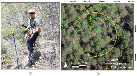 HMLS data were collected at the end of May 2023 using a GeoSLAM ZEB-Horizon unit (GeoSLAM Ltd., Ruddington, UK) (Figure 2a), capable of scanning 300,000 points per second with a maximum scan range of 100 m and a 360° × 270° field of view. Scans were performed following methods similar to those described in Gollob et al. (2020) [45,52]. The scanning procedure commenced at the center of each plot, followed by an inner circular scan approximately 1 m from the plot’s center and an outer circular scan at the plot’s boundaries, pointing towards the center of the plot. Next, a detailed scan was performed within the plot in densely vegetated and shadowed areas to mitigate occlusion issues, concluding the scan at the starting point located at the plot’s center. An example of a typical scan path on a plot can be observed in Figure 2b. The scanning time for each plot was about 10–15 min (longer in denser plots). The interaction of the laser system with the vegetation generated highly dense three-dimensional point clouds, with an average point density of 63,148 points/m2 for all plots (detailed densities for each plot are presented in Table S1 of the Supplementary Materials). Since the HMLS system did not incorporate an inertial measurement unit, data were collected in local coordinates (i.e., the center of the plot had coordinates XY 0,0) and were subsequently georeferenced to a coordinate reference system. To achieve this, 5 ground control points (GCPs) were established in each plot before the start of the scans with the Leica Viva® GS15 CS10 GNSS. One GCP was positioned at the center of the plot, and the remaining four were placed at each of the cardinal points of the plot’s boundaries (Figure 2b). During the scans, the HMLS remained static and at ground level on each GCP for at least 10 seconds to record the local coordinates, which were then matched with the coordinates obtained from the GNSS at the same GCP. For data preprocessing, the proprietary software GeoSLAM Connect v.2.3.0 was employed. It involved the conversion of scans into LAS files and georeferencing local coordinates to a coordinate reference system (EPSG: 25830–ETRS89/UTM zone 30N). For the latter, the ‘Stop and Go alignment’ tool was utilized, facilitating the association of the local coordinates registered with the HMLS to the coordinates recorded with the GNSS at each GCP in the coordinate reference system. The mean georeferencing error for all plots was 0.161 m (detailed results are provided in Table S1 of the Supplementary Materials).