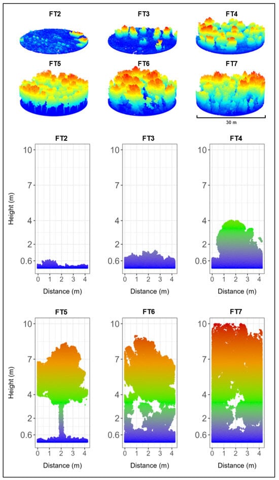 A preliminary assessment of the differentiation capability between the Prometheus fuel types was conducted through a visual analysis of the point clouds. Figure 4 illustrates the structural heterogeneity of vegetation at both the plot and transect scales by fuel type. It can be observed that the acquired and processed data successfully represent the vertical distribution of vegetation, even in the upper strata (e.g., canopies), which are further away from the ground, where data are acquired. The LSh, MSh, and HSh strata (i.e., shrub strata) are predominant in FT2, FT3, and FT4, respectively. In addition, some scattered larger shrubs or small trees can be found in the FT2 and FT3 plots, while FT4 exhibits a greater spatial continuity of tall shrubs. In FT5, the point cloud clearly represents the tree profile and the absence of an understory. Continuity of vegetation can be observed between the lower and upper strata for the tree fuel types, as in FT6, but to a lesser extent compared to FT7, where the fuel reaches the maximum structural volume and the highest stand compactness.