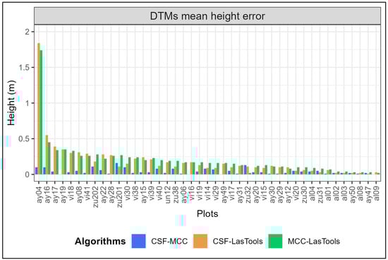 Figure 5 depicts the results of the comparative analyses of the mean height error for each plot and between algorithms. The detailed results can be found in Table S2 of the Supplementary Materials. There were minimal differences in the height values extracted from the MCC and CSF (mean error = 4 cm, standard deviation = 4 cm), whereas, with LasTools, the differences with the other two algorithms were slightly larger (LasTools–MCC: mean error = 19 cm, standard deviation = 28 cm; LasTools–CSF: mean error = 20 cm, standard deviation = 26 cm). Regarding the classification process, the MCC took considerable time to process the decimated point cloud, while LasTools and the CSF processed the complete point cloud in less time. Therefore, based on these results, the CSF algorithm was chosen as the most suitable for filtering and classifying the point clouds into ground and non-ground points to normalize the heights of the point clouds.