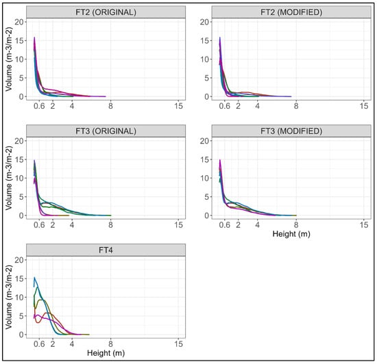 Vertical distribution of the volume of fuel load every 0.05 m of the Prometheus shrub fuel types. Each line represents a forest plot arranged by the fuel type estimated in the field (left) and corrected with HMLS data (right). No modifications were made in FT4 plots.