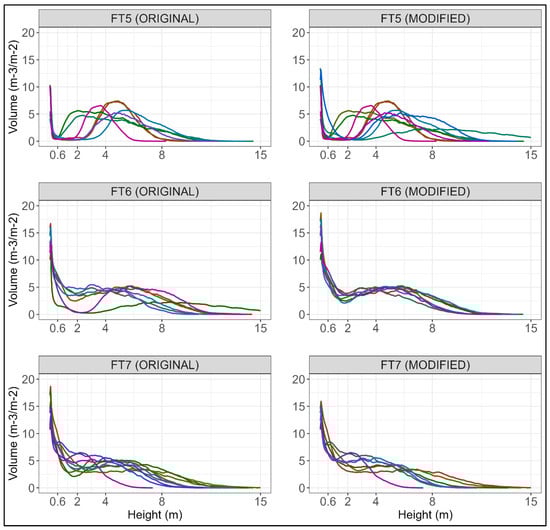 Regarding the Prometheus tree fuel types, FT5 displays a distinctly bimodal distribution, with a primary peak in the LSh stratum and a secondary peak starting in the HSh stratum and continuing into the Tr stratum or originating directly in the Tr stratum, with a minimal fuel load volume in the MSh stratum. The distribution of FT6 exhibits a peak in the LSh stratum, followed by a decrease in the MSh stratum and a slight increase in the HSh stratum, culminating in a gradual decline from the Tr stratum. FT7 exhibits a very similar distribution to FT6, except for a more consistent volume along the MSh and HSh strata before declining from the Tr stratum. This indicates greater volume in the intermediate strata and consequently, more vertical continuity of the fuel load, characteristic of this type. These findings revealed misidentifications of ground truth in six tree-type fuel plots. Two plots, initially categorized as FT6 (‘ay12’ and ‘ay49’), were reassigned to FT5 due to the distinct bimodality of their distributions and minimal volume present in the MSh and HSh strata. Another plot initially labeled as FT6 in the field (‘ay31’) was corrected to FT7, as it demonstrated a consistent fuel volume between the LSh and MSh strata. Moreover, three plots originally labeled as FT7 (‘ay06’, ‘ay19’, and ‘ay28’) were modified to FT6, as their distributions indicated a decrease in volume in the MSh stratum, suggesting less vertical continuity of vegetation. Finally, a plot labeled as FT7 (‘vi41’, corresponding to the pink line in the FT7 plots of Figure 7) displayed a distinctive signature compared to others of the same fuel type. While this plot could potentially fall between FT4 and FT7 due to its clear bimodality resembling some FT4 plots, the significant fuel load from the Tr stratum, persisting until approximately 8 meters, suggests excessive height for the FT4 plot. Consequently, the ground truth was not modified, assuming it to be a FT7 plot with a low tree height.