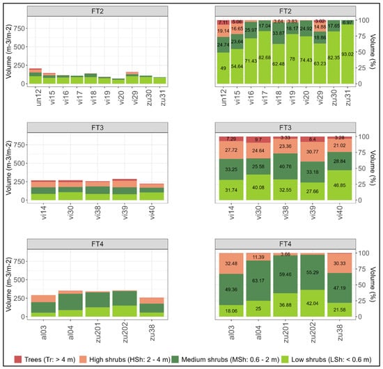 The quantification of fuel load by Prometheus height strata confirmed the corrections made to the ground truth in the 10 forest plots. The results presented below are grouped by the fuel types modified from the HMLS data, as mentioned in the previous section. Figure 8 illustrates the fuel volume of each Prometheus shrub fuel type, revealing a generally progressive increase in the total volume from FT2 to FT4; specifically, the volume is less than 250 m3/m2 in FT2, slightly over 250 m3/m2 in FT3 (except for one plot: ‘vi40’), and somewhat higher than 250 m3/m2 in FT4. Plot ‘vi40’ was misclassified as FT2 in the field and is the only one among FT3 that does not exceed 250 m3/m2 of the total volume. This suggests that this plot could be on the border between FT2 and FT3. However, the percentage of volume contained in the MSh and HSh strata in this plot is quite high (>20%), resembling the percentages of FT3 plots more closely. Regarding the percentage of volume in each Prometheus stratum, a clear dominance of the LSh stratum is observed in FT2 (>50% of the total volume in all plots except for one), with greater parity in FT3 but with more significant proportions in the two lower strata, and a predominance of the MSh stratum in FT4. As expected, the percentage of the total volume in the Tr stratum is almost negligible in the three shrub types. Only three FT2 plots have volume in the HSh and Tr strata, which are related to the small volume increments seen in these strata in Figure 5 and explained before. There is a higher volume percentage in the Tr stratum in the FT3 plots, but they are still low values, while there is hardly any in FT4. Finally, it is worth noting that the volume of the plots where the ground truth was corrected (‘vi17’, ‘vi40’, ‘zu30’, and ‘zu31’) fits quite well within their respective new groups.