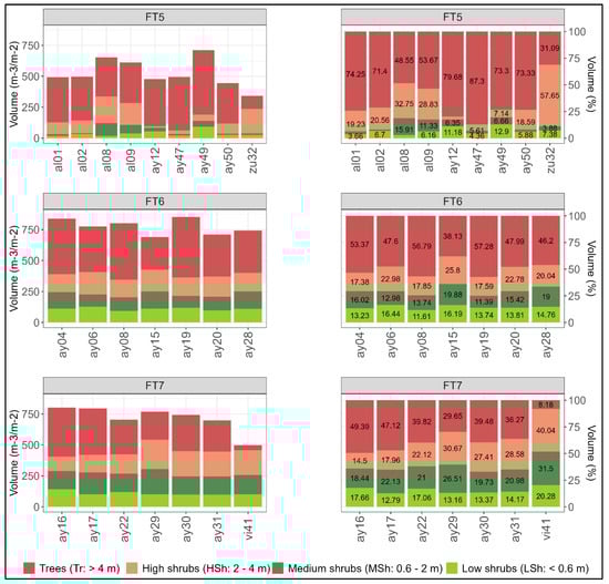 In the Prometheus tree fuel types, there is a lower volume of fuel load in FT5 (<750 m3/m2) due to the absence of understory and a slightly higher volume in the FT6 plots compared to FT7 (Figure 9) due to a greater volume of tree canopies in the former. In general terms, the dominant stratum in these types is the Tr stratum, reaching the highest percentages in the FT5 plots. The FT7 plots have greater uniformity in the volume contained in each Prometheus stratum, although some plots show similar volume percentages in the MSh and HSh strata to others identified as FT6 (e.g., ‘ay16’ and ‘ay17’). This may be an indicator of the high complexity of the vertical fuel structure in both types. However, in the FT6 plots, there are no cases of a volume percentage higher than 20% in the same plot in both the MSh and HSh strata, while this is a characteristic in most FT7 plots, suggesting a greater vertical continuity of fuel between the strata in the latter. Regarding FT5, the amount of volume in the LSh and MSh strata is very low, and appreciable amounts are only found in plots ‘al08’, ‘al09’, ‘ay12’, and ‘ay49’. In the case of the former two, it is due to a higher percentage of MSh strata, although this percentage is not high. The latter two were labeled in the field as FT6 because they had a higher volume of fuel in the MSh stratum compared to the other FT5 plots. However, their volume by Prometheus height strata seems to fit better in FT5, confirming the corrections made previously. Plot ‘zu32’ has the most distinctive volume distribution of all FT5 plots, as the dominant stratum is the HSh stratum, assuming that this is a FT5 plot with a low tree height. On the other hand, the volume of plot ‘ay31’, whose fuel type was labeled as FT6 in the field, fits quite well as FT7. Plots ‘ay06’, ‘ay19’, and ‘ay28’, which transitioned from FT7 to FT6, also seem to fit better with their new type. Lastly, it is confirmed that plot ‘vi41’ is a ‘low FT7’ plot since it has very little volume in the Tr stratum but a lot in the HSh stratum. Its distribution closely resembles those of FT4 plots, although with significantly more volume in the upper strata, so it might not be appropriate to be labeled as FT4.