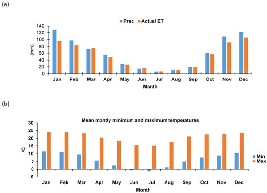 Climate of the study area (a) mean monthly precipitation and actual evapotranspiration rate (b); mean monthly minimum and maximum temperature adapted from [84].