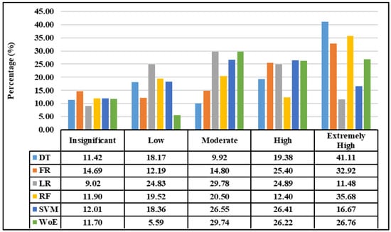 The DT outperformed other models with the highest accuracy value of 0.96, although the model reported the lowest prediction rate. Similarly, both RF and SVM demonstrated poor prediction performances with AUC values of 0.53 and 0.59, respectively. Meanwhile, the LR and FR achieved moderate prediction performances. The WoE was used to record the best prediction rate, i.e., 0.74.
