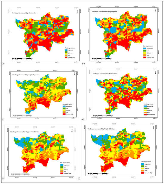 Fire-danger mapping in the Golden Gate Highlands National Park (GGHNP) using (a) decision tree (DT); (b) frequency ratio (FR); (c) logistic regression (LR); (d) random forest (RF); (e) support vector machines (SVM); and (f) weight of evidence (WoE) models.