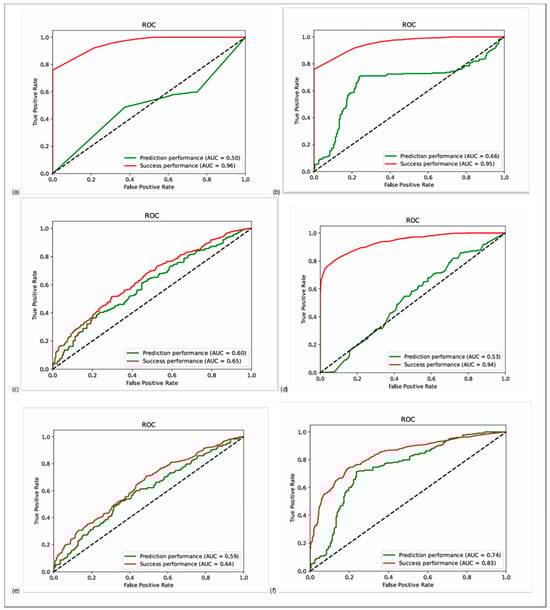 ROC/AUC (area under the receiver operating characteristic curve) results of the (a) decision tree (DT), (b) frequency ratio (FR), (c) logistic regression (LR), (d) random forest (RF), (e) support vector machines (SVM), and (f) weight of evidence (WoE) models used in the wildfire-danger assessment in the Golden Gate Highlands National Park (GGHNP).