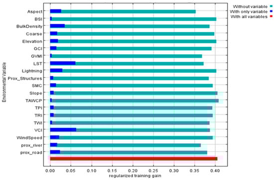 Like the GEE classifier, the SZ plugin suffers from the limitation of variable importance analysis. The relative importance and contribution of each driving factor for predicting fire-danger models were determined by using the maximum entropy (MaxEnt) Version 3.4.4 algorithm [22,75,76,147,148]. A major advantage of MaxEnt model is that it allows for the assessment of all the input predictor variables in order of their significance [22]. According to the MaxEnt modelling, the probability distribution with the highest entropy is the best one and the most significant [149]. Furthermore, WoE and FR algorithms can determine the spatial association between the classes of each driving factor and fire occurrence. The Wf (weight of contrast) value and FR were used to determine the spatial correlation between the driving factor and the fire-occurrence probability [44,45,46,136].