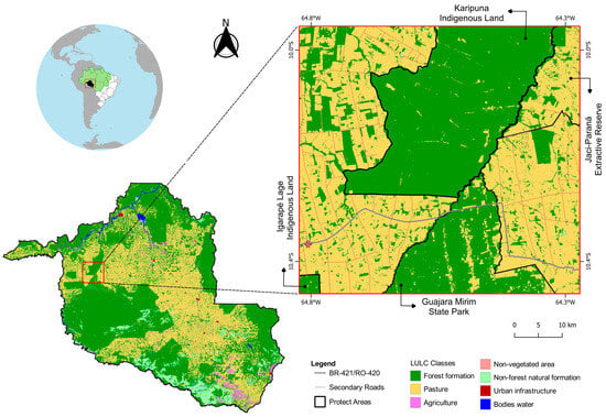 - Lopes, J.M.A.; Santos, A.M.; Nunes, F.G. Análise do desmatamento nas áreas de influência da BR-421 e as pressões sobre áreas especiais no oeste de Rondônia. Soc. Territ. 2019, 31, 282–304. [Google Scholar] [CrossRef]