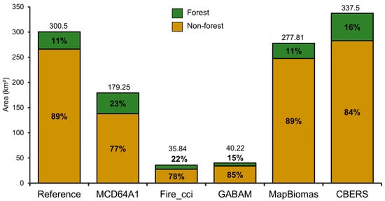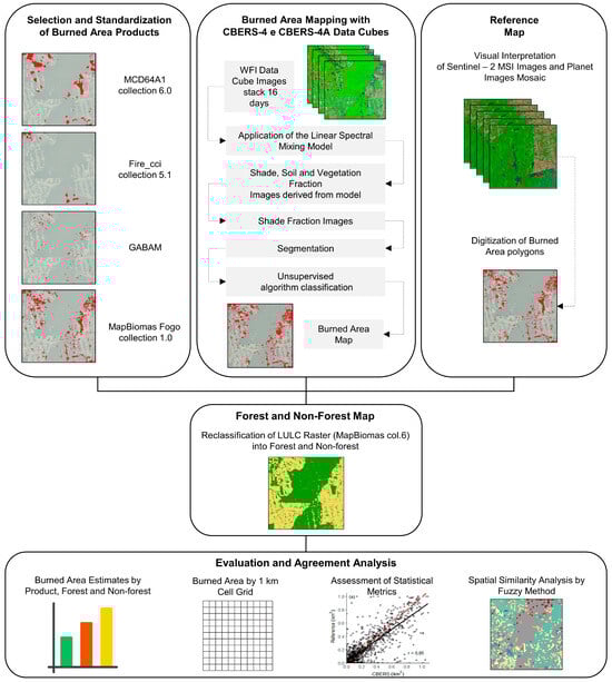 - Rodrigues, J.A.; Libonati, R.; Pereira, A.A.; Nogueira, J.M.P.; Santos, F.L.M.; Peres, L.F.; Santa Rosa, A.; Schroeder, W.; Pereira, J.M.C.; Giglio, L.; et al. How well do global burned area products represent fire patterns in the Brazilian Savannas biome? An accuracy assessment of the MCD64 collections. Int. J. Appl. Earth Obs. Geoinf. 2019, 78, 318–331. [Google Scholar] [CrossRef]