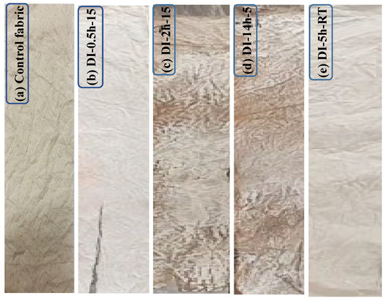 Optical images of coated samples showing color range and other physical properties (a) Control fabric (b) DI-0.5 h-15, (c) DI-2 h-15, (d) DI-14 h-5 and (e) DI-5 h-RT.