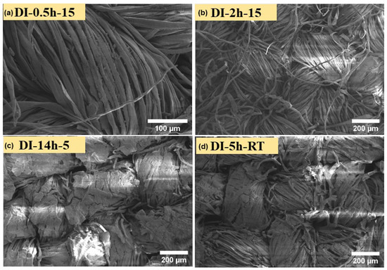 LV-SEM surface micrograph of the coating deposited on the cotton fabric (a) DI-0.5 h-15, (b) DI-2 h-15, (c) DI-14 h-5 and (d) DI-5 h-RT.