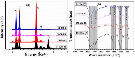 The elemental composition of the coating was inspected using EDS analysis techniques, conjointly attached with the SEM microscopic equipment. An elemental profile for each coating can be seen in Figure 3a, supported by the quantitative outline, as in Table 2. The major components of the precursors can be seen as “C” Si, Cl, N and O. From the ethanol and cotton fabric, C and O were obtained, whereas Si was obtained from TEOS. “Cl” was obtained from HCl, whereas “N” was deposited in a lesser amount compared to other components, as can be seen in Table 2 and the elemental profile plot. The presence of an excessive amount of “Si” suggests successful deposition of the sol–gel components to the individual fibers and could help to protect the coated fabric against fire. The percentage of the “Si” can be seen as a monotonic relationship with dipping time, as can be seen from the quantitative values. Initially, for 0.5 h, Si ~7.89% was obtained. However, as the dipping time increased, the percentage of the “Si” increases. With recurring decrease in the dipping time, “Si” followed suit and 11.40 % was obtained. The peak intensities were found to be random with the non-uniform coatings obtained in the different samples. However, a contrasting trend can be observed for “N”. “N” was higher with lower dipping times, at ~12.37%. However, it decreased with increasing dipping times and finally reached ~7.35%. As the dipping time decreased again, the percentage of “N” again rose.