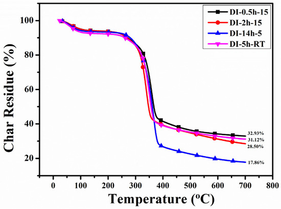 The thermal degradation process of the control and treated samples in a nitrogen and air atmosphere was investigated using thermogravimetric analysis, and the characteristic curves of the respective TGA and DTGA can be seen in Figure 4 and Figure 5. A lot of information can be obtained from the TGA and DTGA curves, such as T5% (temperature at which mass loss~5%), which is regarded as the temperature of starting degradation, and Tmax, which is the maximum rate of degradation and char residual quantity at ~700 °C, as listed in Table 3. The highest Ton (which is the starting point of combustion) was obtained for DI-5 h-RT of ~314.09 °C with a respective Toff (ending point of combustion) of ~366.59 °C. In contrast, the lowest Ton was obtained for the sample DI-2 h-15, of ~296.53 °C, and the Toff was ~357.90 °C. The difference in the Ton suggests that degradation of DI-2 h-15 was initiated 20 °C earlier than that of DI-5 h-RT. The char residue of the coated samples obtained at 700 °C was ~32.93%, ~28.50%, ~17.86% and ~31.12% for DI-0.5 h-15, DI-2 h-15, DI-14 h-5 and DI-5 h-RT, respectively. It can be observed that the higher residue obtained for DI-0.5 h-15 and DI-5 h-RT was either due to the lower dipping time or lack of heat treatment. The higher dipping time caused the acidic samples to affect the cotton fabric and thus could easily degrade during thermal degradation. Likewise, a longer dipping time and slight heat treatment could aggravate the degradative effect of the acid samples in the coating matrix. The superior anti-degradative behavior of DI-5h-RT can be attributed to the complex network of the N-Si-Cellulose formed at optimum conditions of 5 h dipping and no heating, thus leading to significant resistance to the degradation. However, the longer dipping time and heating could lead to a broken N-Si-Cellulose network and thus may not resist fire effectively. In addition, maximum degradation occurred by increasing the temperature from Ton to Toff for DI-5h-RT up to ~700 °C, which is a relatively larger temperature period with respect to the other samples. Lowering of the Ton and Toff temperature values for the sample DI-2h-15 resulted a positive decrease in the peak degradation temperature of the respective smaple. In addition, to explore the peak degradation temperature, the derivative of the TGA curves (DTGA) was obtained, as shown as Figure 5. The maximum peak degradation temperature was recorded as ~367.34 °C for the sample DI-5 h-RT, while the lowest peak degradation temperature was recorded as ~341.69 °C for DI-2 h-15. The highest peak degradation temperature suggests higher stability against the heat, offered by the coated materials and char formed on the surface of the cotton fabric. From the DTGA curves, it can be seen that the char serves as an oxygen and heat barrier, which restrains the thermo-oxidative degradation of the cotton fabric at higher temperatures.