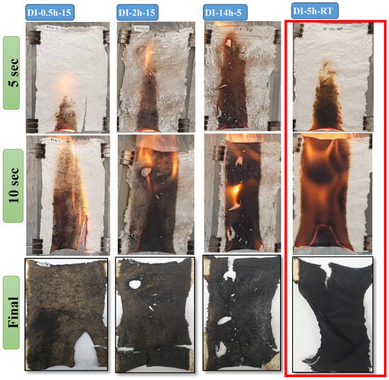 According to the VFT results, shown in Figure 6, it can be seen that the samples dipped for longer times and heat treated were mechanically rigid, damaged and broken, in addition to presenting a shift in color. Moreover, from the flame spread, as in the 10 s images, the samples with longer heat-treated times and longer dipping times were engulfed by flames in a shortest time, compared to the other samples, which resisted the flame quite efficiently. The samples obtained with shorter dipping times and no heat treatment were found with considerable char residue and zero after-glow effects. In addition, a significant decrease in the burning rate was observed for DI-0.5 h-15 and DI-5 h-RT, which could be attributed to the effective physical barrier layer formed by the silica–melamine complex network. In addition, DI-0.5 h-15 and DI-5 h-RT can be seen as mechanically stable and thus could play a role in blocking the transfer of flame from one place to another. The lower burning rate and higher burning time, shown in Figure 7, further suggest effective catalyzing of the dehydration process by the acidic samples’ complexes in the initial stage, which ultimately speed up char formation and block the spread of the flame, as mentioned in Table 4 [47,48,49]. However, complete extinguishing of the flame could not be obtained for any samples, suggesting that there is still room for further improvement. The residues obtained for the sample with the shorter dipping time were more integrated and compact, as can be seen in the DI-5 h-RT sample, which is in agreement with the above discussion of the drastic effect of the acidic species on the substrates.
