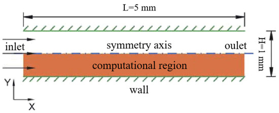 The physical model used in this study is composed of two parallel, infinitely thick plates, as shown in Figure 1, forming a rectangular microchannel with a length (“L”) and height (“H”) perpendicular to the direction of the straight plane and infinite thickness. It is assumed that all quantities are equal along the thickness direction, so the model can be simplified to a two-dimensional structure. This work focuses on the influence of wall reactions on OH radicals in premixed methane/air flames, so the thickness of two parallel plates is set to 0 to eliminate the heat-transfer effect of wall. In order to highlight the influence of chemical reaction, the distance between the two walls is reduced to 1 mm. Furthermore, the plate is set to be isothermal with infinite thermal conductivity, so thermal cycle is not considered in this model. The premixed and preheated methane/air mixture enters the gap between two parallel plates, which is symmetrical relative to the central axis; that is, the height direction is the same up and down. Therefore, in order to reduce the calculation, only half of the region needs to be considered in the calculation process, and the selected region is analyzed by two-dimensional Cartesian coordinates as shown in Figure 1. During the calculation process, the premixed methane/air gas flows uniformly from the left side of the microchannel into the interplate for combustion at a certain speed.