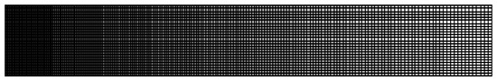 ANSYS Fluent 17.0 software is used as the CFD numerical calculation platform. The software runs on the computing workstation (main frequency 2.6 GHZ, 22 cores, 44 threads), and 40 threads are called in each calculation. The microburner studied in this simulation has a microchannel length (L) of 5 mm and a height (H) of 1 mm, as shown in Figure 1. The calculation area is the entire microburner, where a non-uniform grid is used in the X direction and a uniform grid is used in the Y direction. The number of grids in the X and Y directions are 200 and 25, respectively, and the total number of grids is 5000, as shown in Figure 2. In order to ensure the accuracy of the calculation, a fine grid quality (Skewness = 0.6; Aspect Ratio = 5:4; Growth Rate = 1.1) is selected. The time step used in the iterative calculation is 1.0 × 10−5 s, and the relaxation factors are selected as 0.3 for pressure, 1 for density, 0.6 for momentum, and 0.8 for the rest. In order to investigate the effect of wall activity on OH radicals in the methane/air combustion reaction, active walls and inert walls were established in this study.