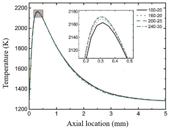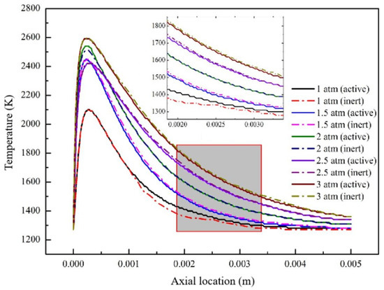 The temperature-gradient distribution on the axis of the inert and active wall surface at different pressures is very significant, as shown in Figure 6. The average and maximum temperatures on the axis at a pressure of 1 atm are the lowest, with the highest temperature occurring near an axial distance of 0.0003 m at about 2100 K. The maximum temperature under each pressure is near the axial distance of 0.0003 m, and both the average and the maximum temperatures on the axis tended to increase with increasing pressure, but the change is slow. The temperature at the outlet under each pressure is not much different and also increases with the increase of pressure.